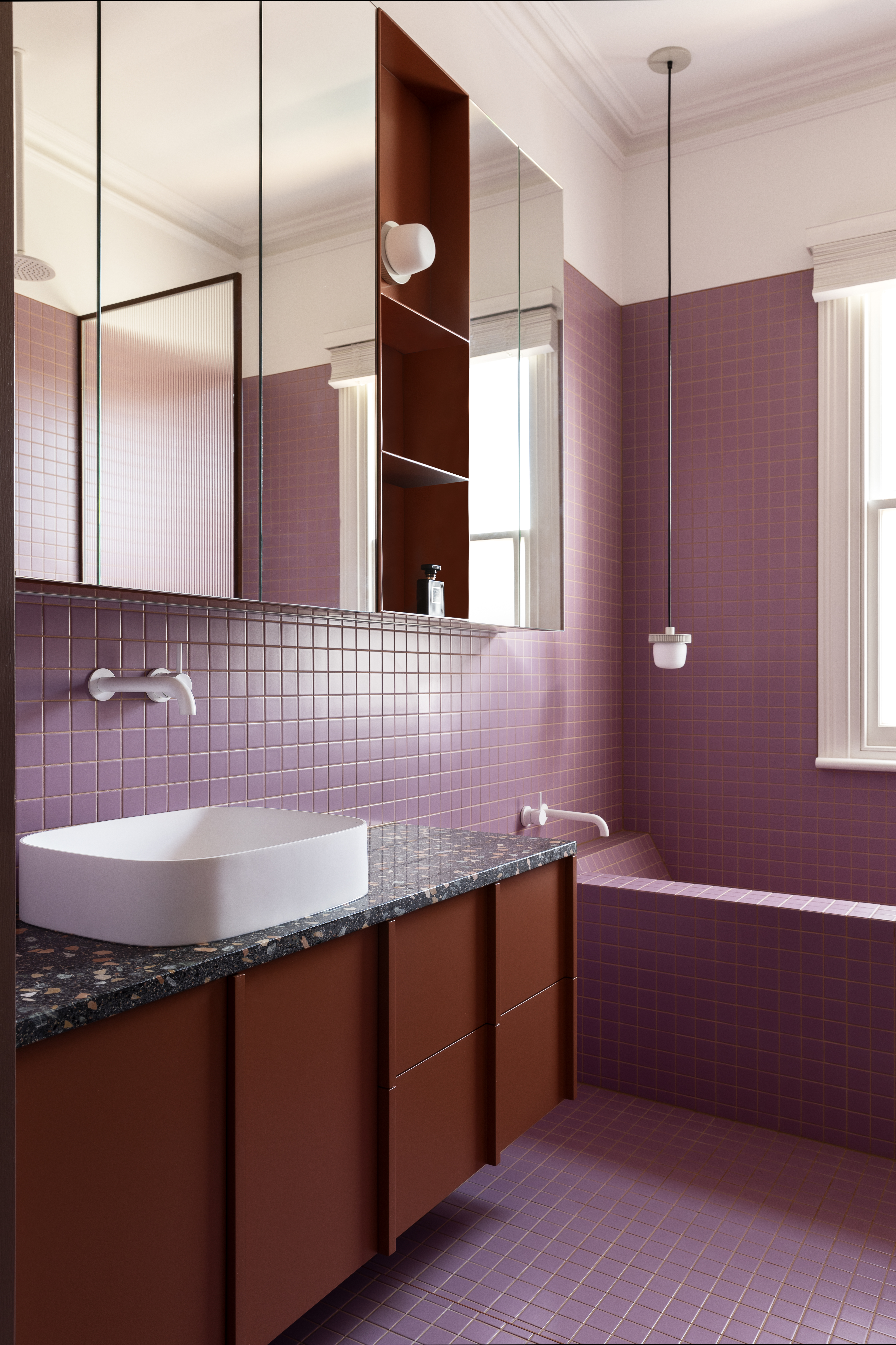 Another source of inspiration came from an Australian-style colour palette of calming green hues in the kitchen, while the bathroom opts for more dreamy shades in lilac, blue and green. Reflecting on the vibrant colour motif, Monique shares: “It injects a newfound yummy personality into the old home.”