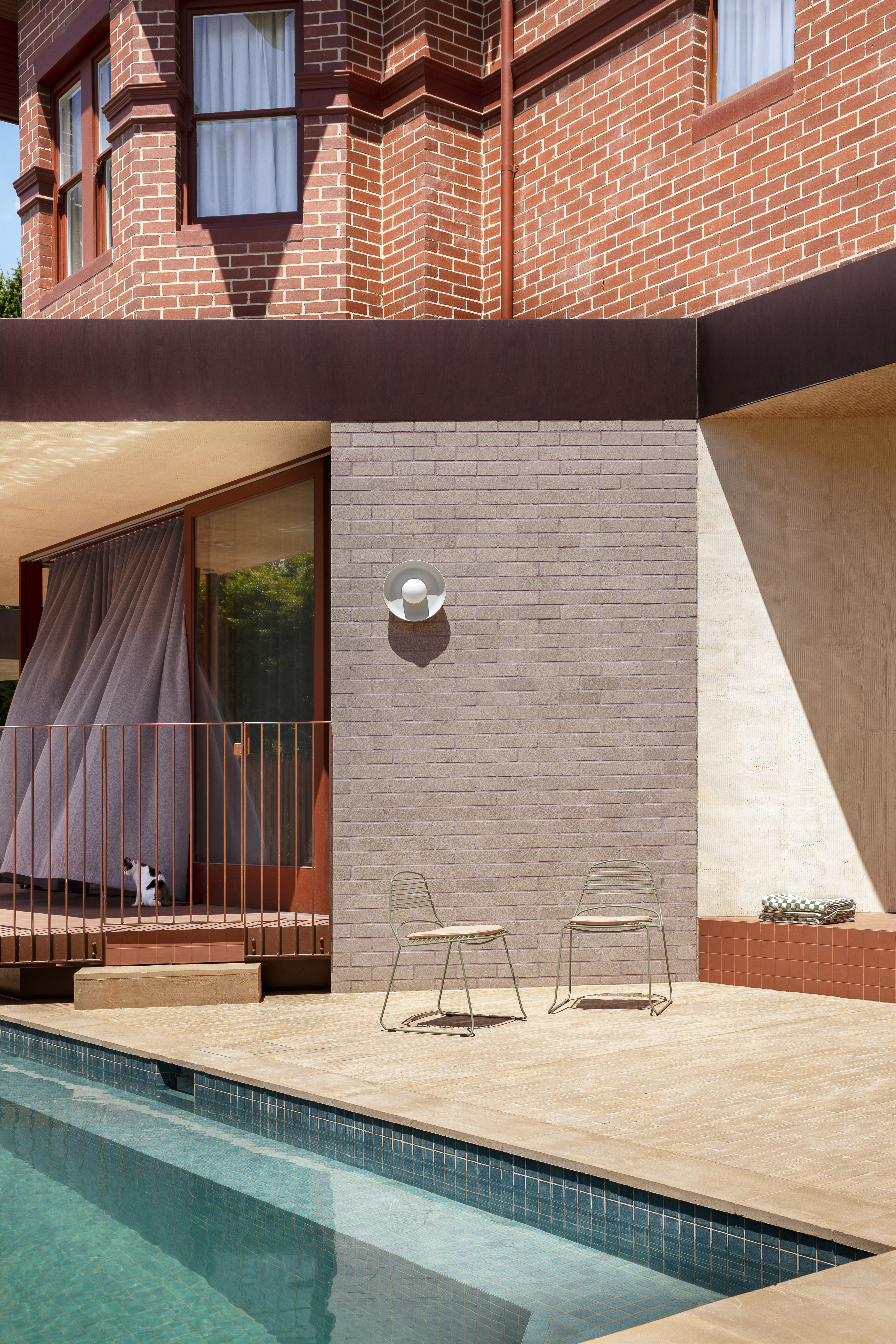 “These ideas were then translated in new and inventive ways, using rust colour-blocking through the exterior, concrete masonry with lilac mortar, and a gradient of warm tones across the home’s paving, terrazzo, joinery and paint finishes.”
