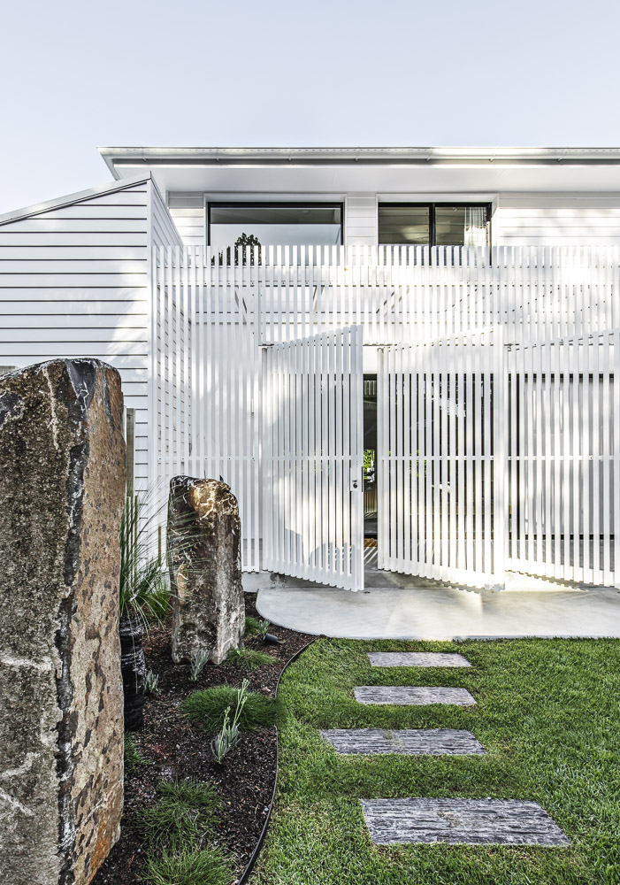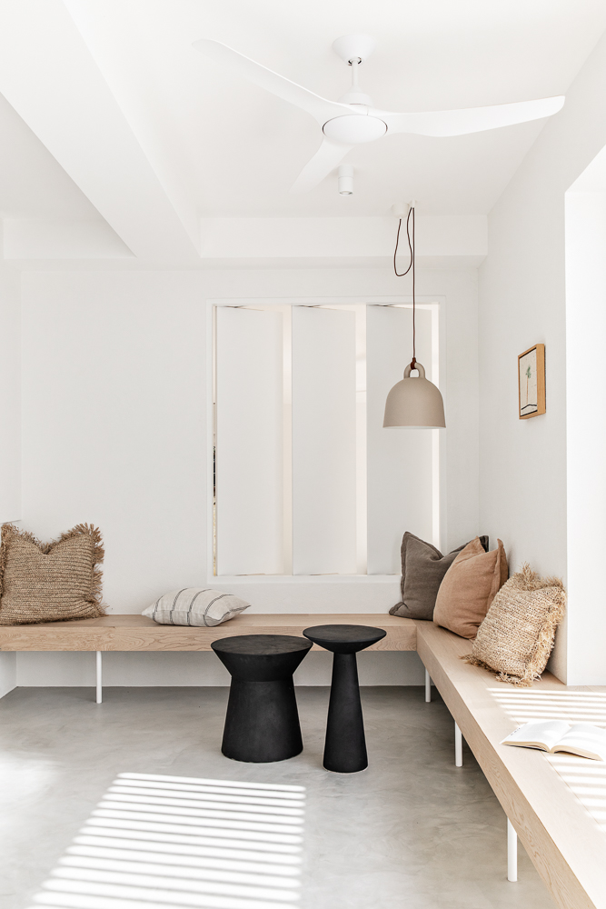 Large windows, glass sliding doors, custom vertical battens and skylights allow natural light to filter into the home. Bringing warmth to the sun-bleached colour palette that features shades of driftwood taupe, deep apricot, misty grey and shell pink, punctuated by black.