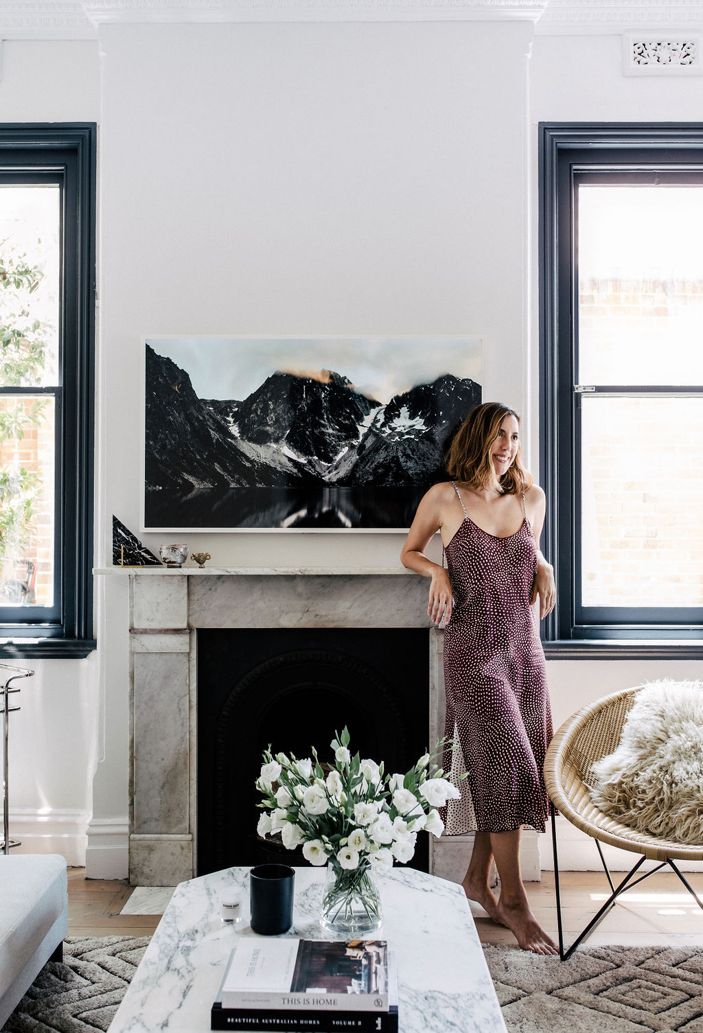 Off the hallway, the living room is asophisticated yet welcoming space with lambskin cushions, a vintage Calacattamarble coffee table (one of Jillian’s favourite pieces), and a sleek bar cart.Jillian also had the original wood-burning fireplace reinstalled, and a SamsungFrame TV placed above, a discreet piece of tech when the TV is in art mode.