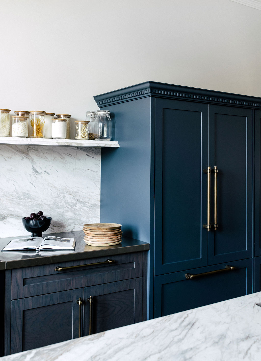 Jillian continues. “The cabinetry ishand-painted in Dulux “Blue Metal” with aged brass handles from Armac Martin. Ilove our Ilve Nostalgie range that has bronze handles that will patina withtime, and the six-gas burner is a dream when entertaining. I always include anappliance cupboard when designing a kitchen, and the same applied here.”