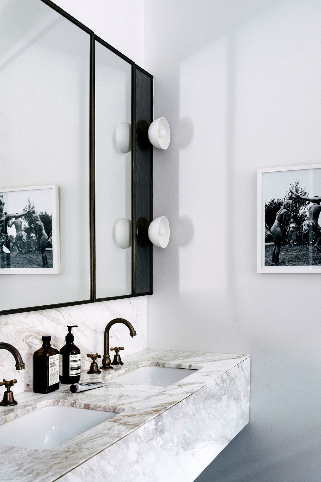 For the master bedroom, Jillian created ahotel at home feel by painting the walls and ceiling a Dulux “Klavier” (a shadeof black), which envelopes the room that features a four-post bed and a Frenchcane bedside table. While the ensuite features wall to wall steel framepartitions that section off the shower and handmade Apparatus Studio lightsthat grace the custom bronze trimmed shaving cabinets and custom-designedmarble vanity.