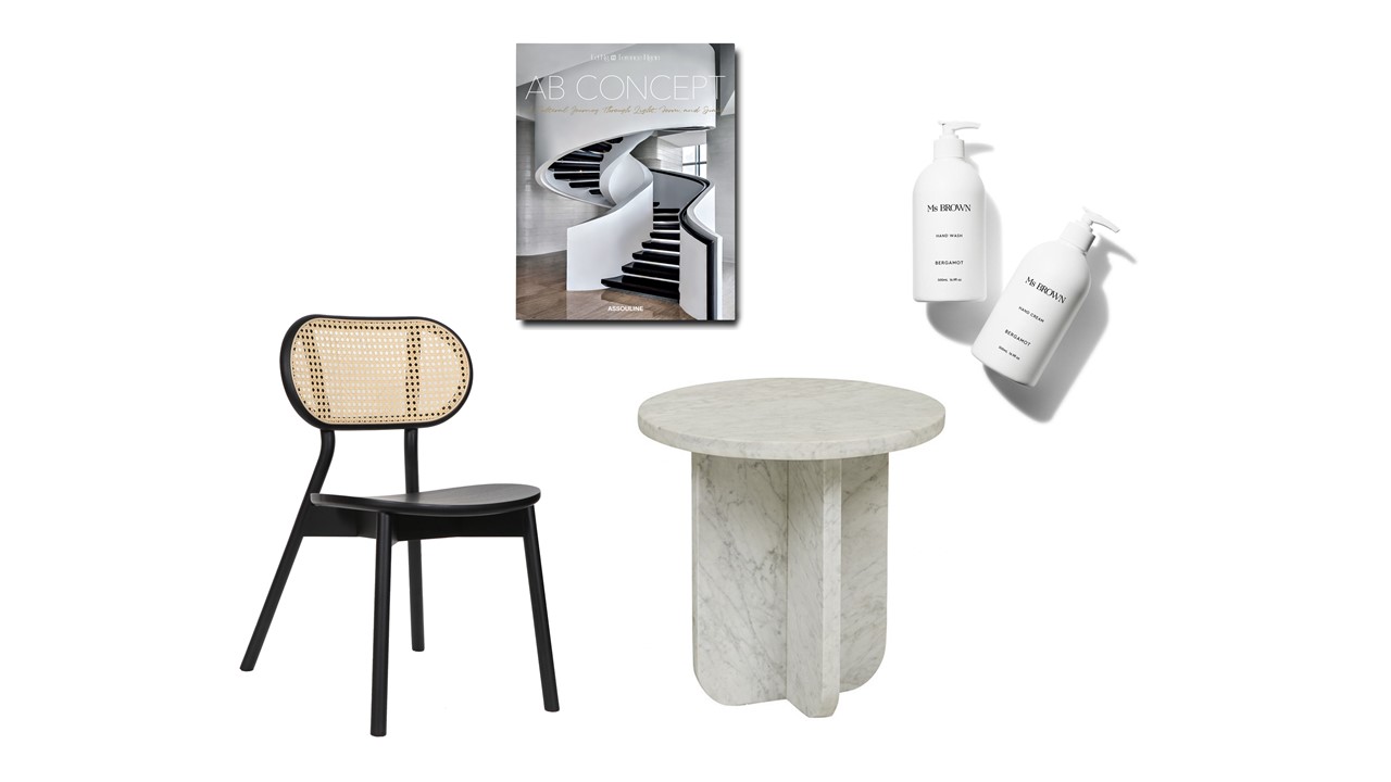 From left to right: Eliza, Cane Chair, Black, $829, Trit House; AB Concept Book, $215.25, Assouline; Amara Curve, Side Table, White Marble, $1,605.00, Globewest; Bergamont Hand Care Duo, $75.00, Ms Brown.