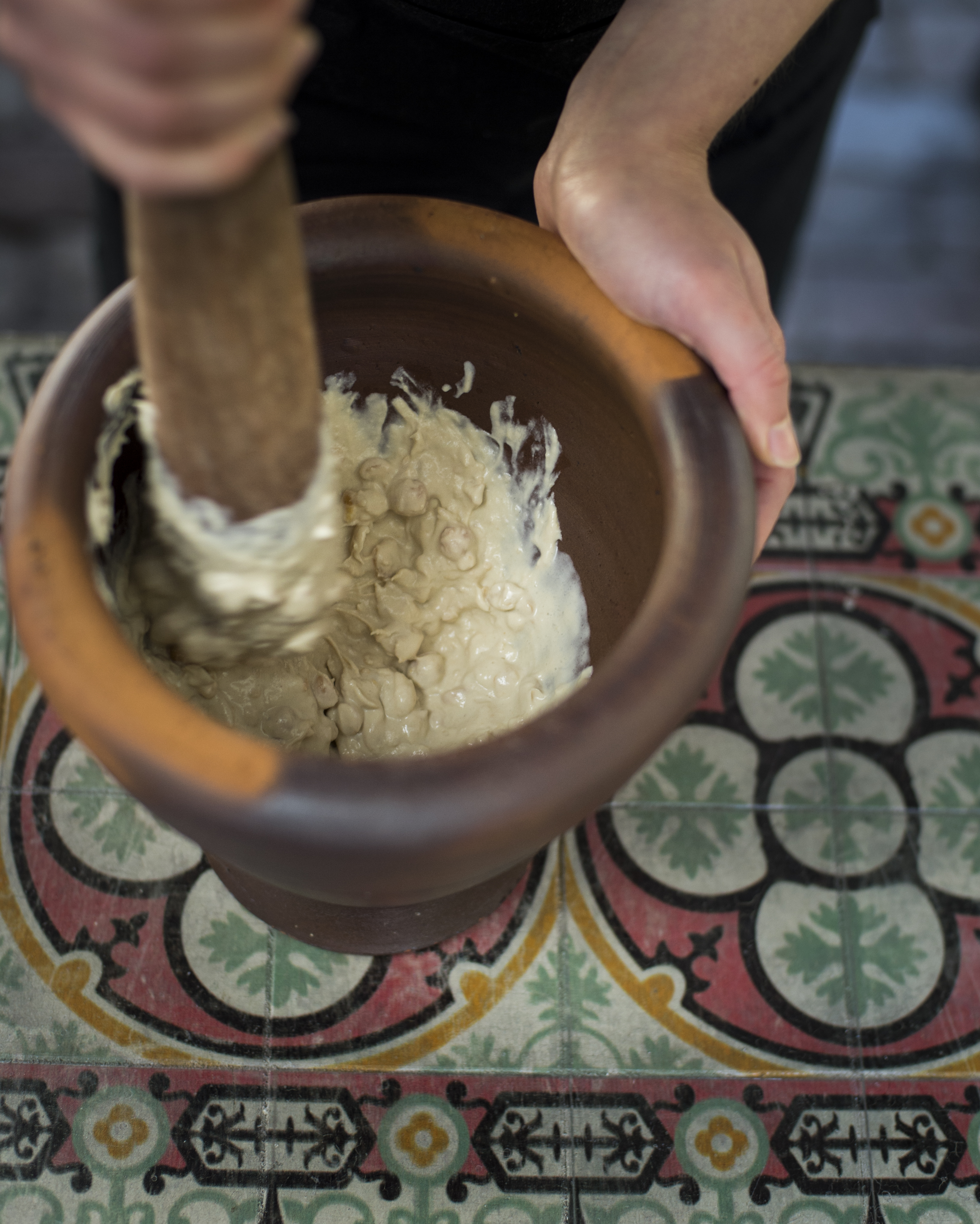 In a large saucepan or bowl soak the chickpeas in cold water (at least 4 times the quantity of the dried chickpeas) for at least 12 hours – overnight is good. Change the water at least twice during the process.Drain the chickpeas and rinse well. Transfer to a large saucepan with a lid. Cover with at least double the quantity of water to the chickpeas and bring to the boil. Cover over medium heat with the lid on for 2 hours, topping up the water as necessary. After 2 hours, if the chickpeas are soft enough, add the baking powder. (If not, continue cooking until they soften up). Cook for a further hour or until the chickpeas start to break down but are not mushy.Put the garlic in a food processor (don’t use a stick blender) with 200 ml water and blend to a very smooth consistency. Put through a sieve and keep the liquid, discard the pureed garlic.Drain the chickpeas. Put them in the food processor and blend to a smooth paste; this will take about 7 to 10 minutes. Add the tahini, reserved garlic water, salt and cumin and blend well, scraping down the sides occasionally and adding more water if necessary. Transfer to a large mixing bowl. Add the lemon juice and gently whisk in (you do not want to over-aerate the hummus and lose the dense consistency).